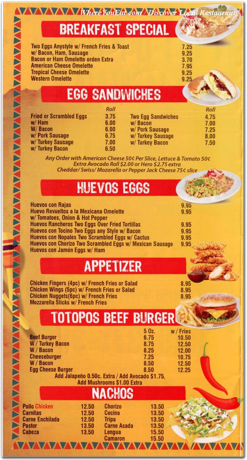 Totopos Taqueria Located in Wakefiled neighborhood of The Bronx. Totopos Taqueria is open Today. Wednesday December 17th from 10:00 am -until 10:00 pm Delivery, is available. Serving Mexican Cuisine