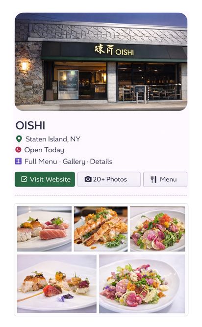 Attract customers searching for "Restaurants Near Me", City & Area dining Guides. Increase Exposure. Build Direct Customers.